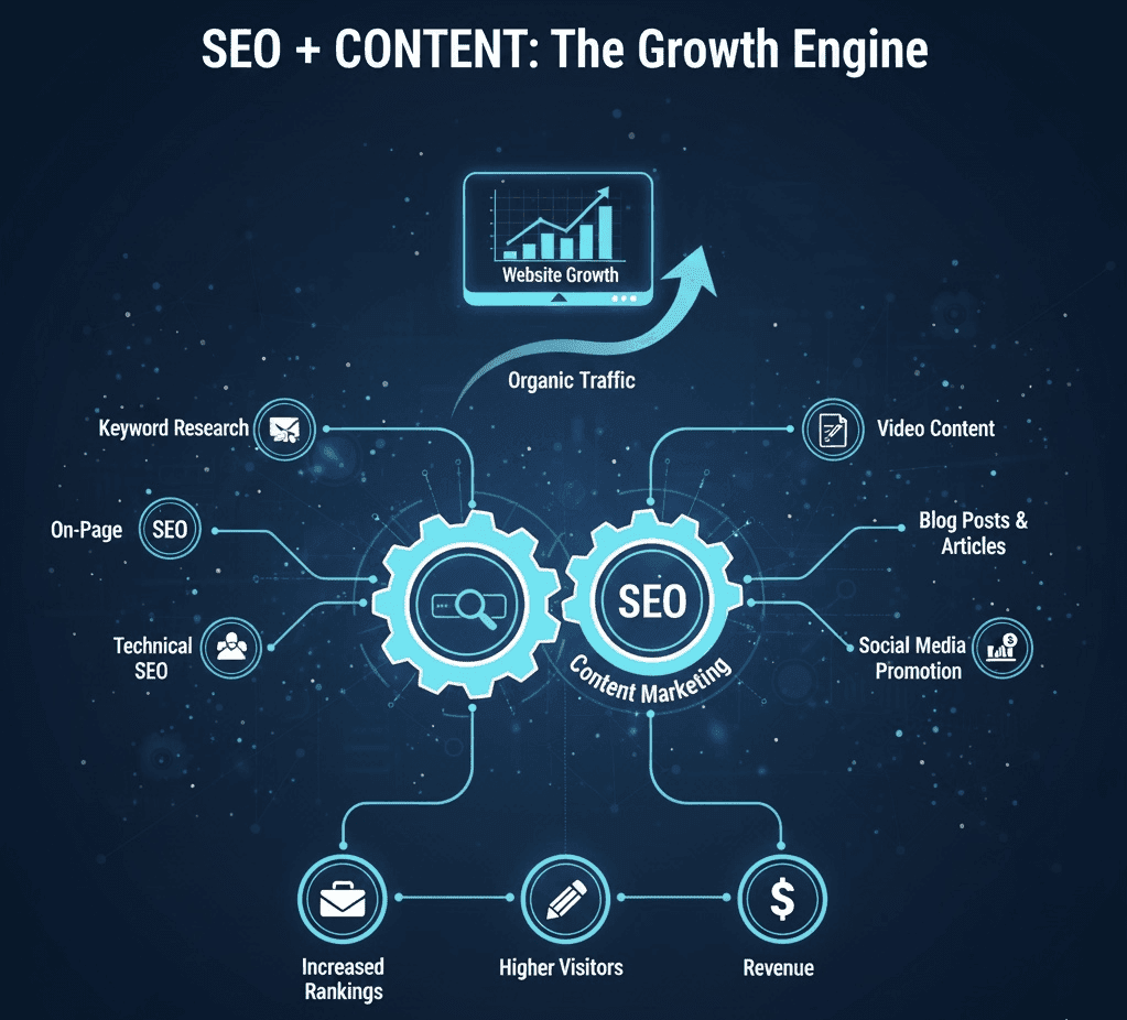 A detailed technical infographic illustrating the intersection of SEO (search engine optimization) and content marketing strategies, highlighting organic traffic and beginner tips for 2026.